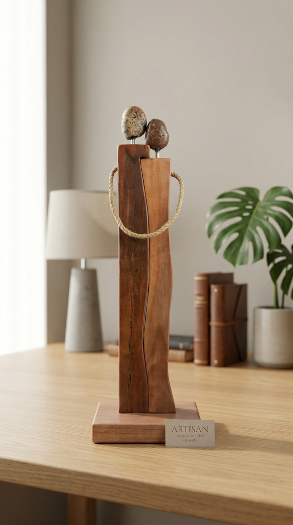Figuras hechas a mano con maderas de roble de demolición. Cabezas de piedras del Rio Cautín, IX región de la Araucanía.