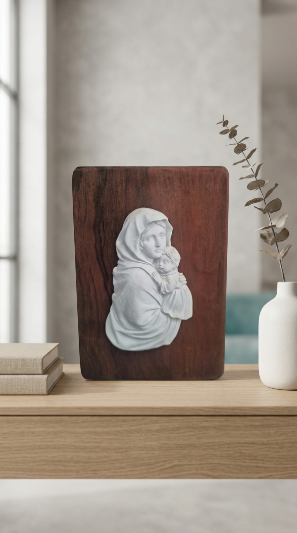 Relieve escultórico de la Vírgen y el Niño sobre madera noble.