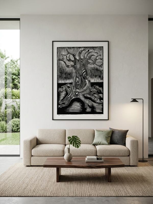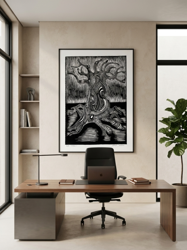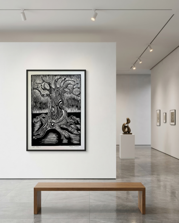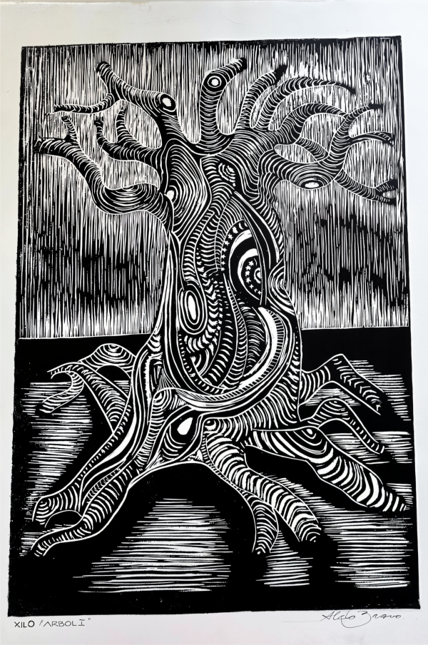 En esta pieza, titulada por el autor como «Árbol I», el artista Aldo Bravo utiliza la técnica del grabado para transformar una forma orgánica en un poderoso tótem gráfico. La obra se aleja del naturalismo para explorar un expresionismo lineal donde cada surco parece representar el flujo de energía vital.