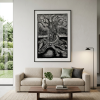 El tronco y las raíces no son meras estructuras botánicas, sino un laberinto de líneas cinéticas que generan una ilusión de movimiento y volumen. El uso del rayado vertical en el fondo crea una atmósfera de lluvia estática o estática visual, lo que acentúa la solidez del árbol frente a un entorno vibrante pero etéreo. Es una obra de gran densidad psicológica, donde la madera (el soporte original) se convierte en el lenguaje mismo para representar la fuerza inquebrantable de la naturaleza.