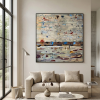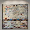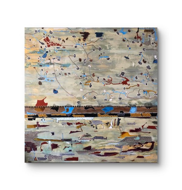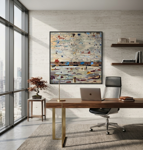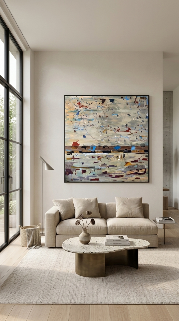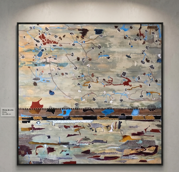 Pero luego, si bajas la mirada, te encuentras con algo mucho más terrenal y pesado. La zona inferior es densa, casi táctil. Ahí, entre fragmentos geométricos y texturas de collage, es donde parecen enterrados los estratos de nuestra memoria: recuerdos sólidos, algunos rotos, que sostienen todo lo demás.