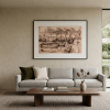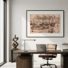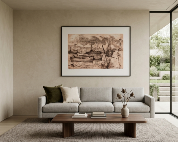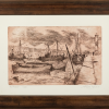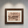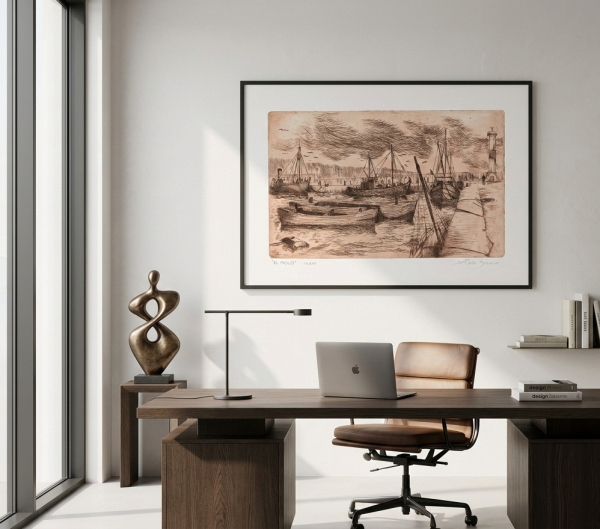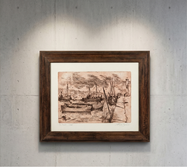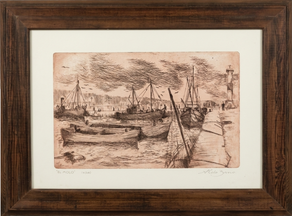 El uso del rayado cruzado y la trama densa en el cielo dota a la composición de una atmósfera dramática, casi tormentosa, que acentúa el carácter de «refugio» del molo. La perspectiva nos guía a través del muelle hacia el faro, mientras que en primer plano, las barcas de madera descansan sobre un agua resuelta con trazos fluidos y seguros. Esta pieza no es solo una representación geográfica; es un homenaje a la identidad porteña, rescatando la estética del Valparaíso histórico a través de un contraste de sepias y negros que evocan la pátina del tiempo y el salitre.